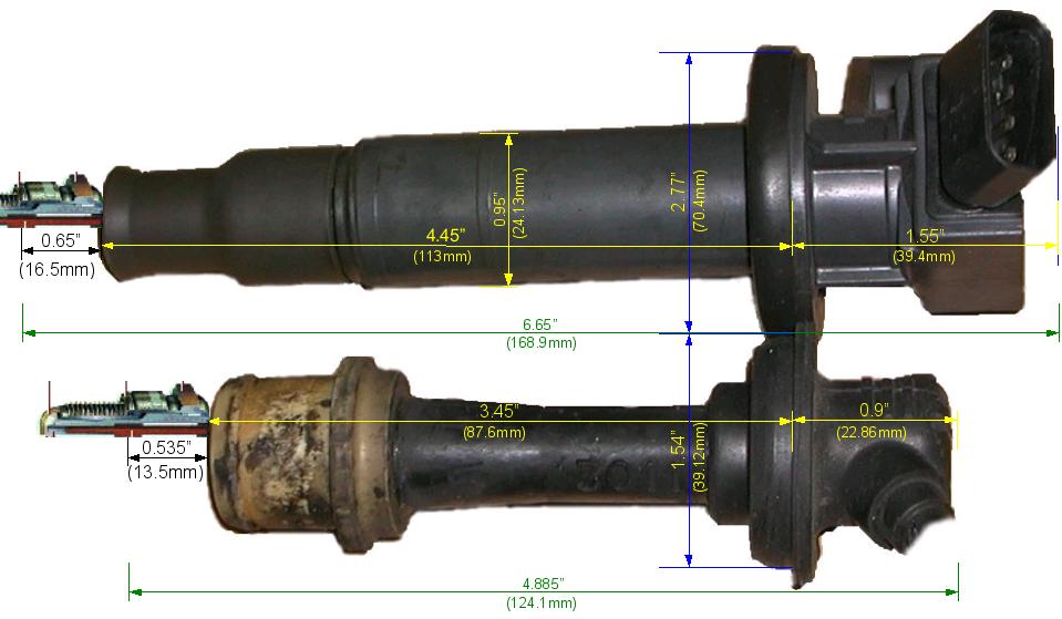 Geometry is slightly different. Diameter at anti vibration rubber is 40-45mm, coil Ø ~23m, long lenght is ~122mm, short one is ~30mm, distance to plug surface is ~17mm.